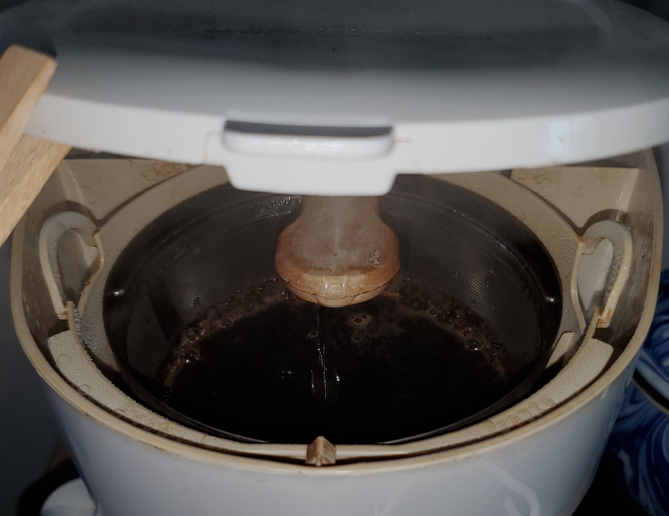 You can see in this next photo, that the water level in the basket is about 1/3 of the way up from the bottom. All of the grounds are floating or submerged. That is precisely what I was looking for.
